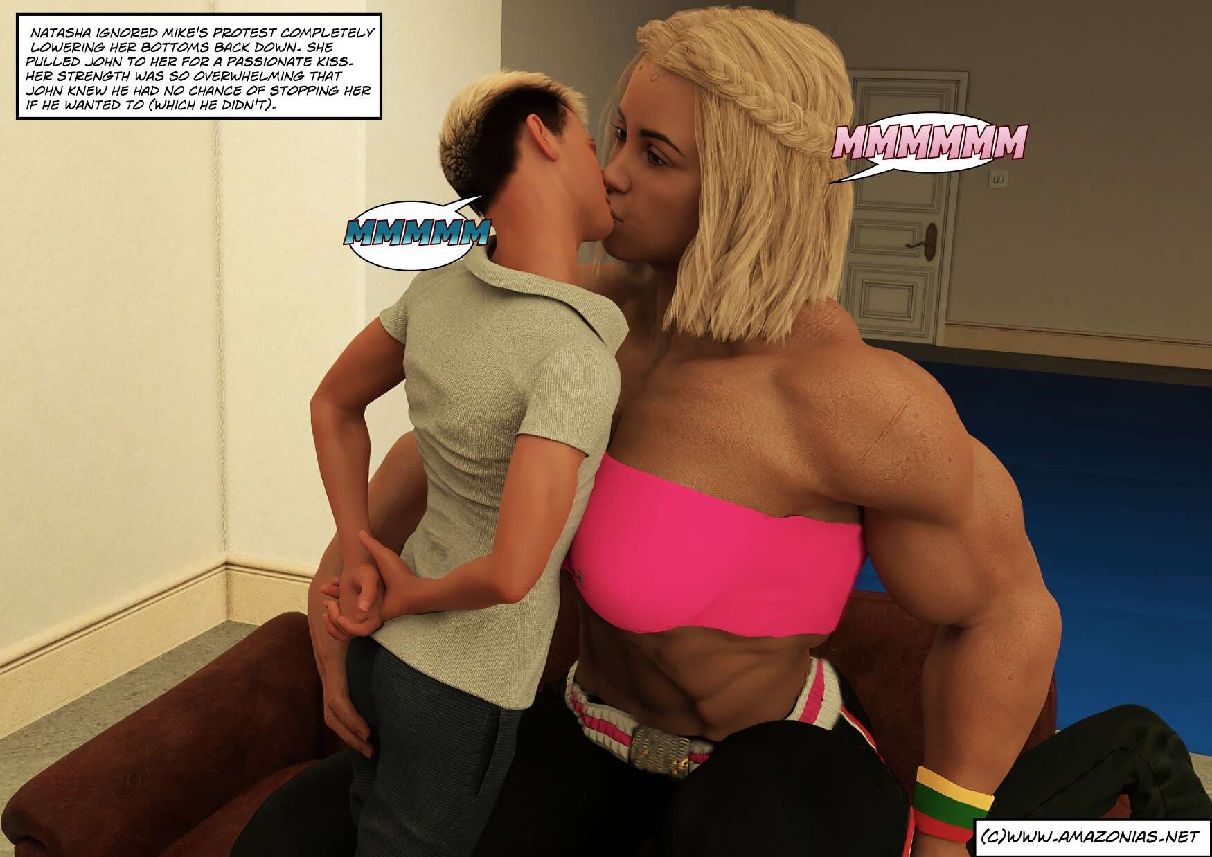 Once again we find the twins Mike and John next to powerhouse Tacha on the couch. It's been some months since we saw this big female bodybuilder in chapter one, and she's quite a bit bigger now, towering over the two siblings, and teasing and playing with them to her heart's content.